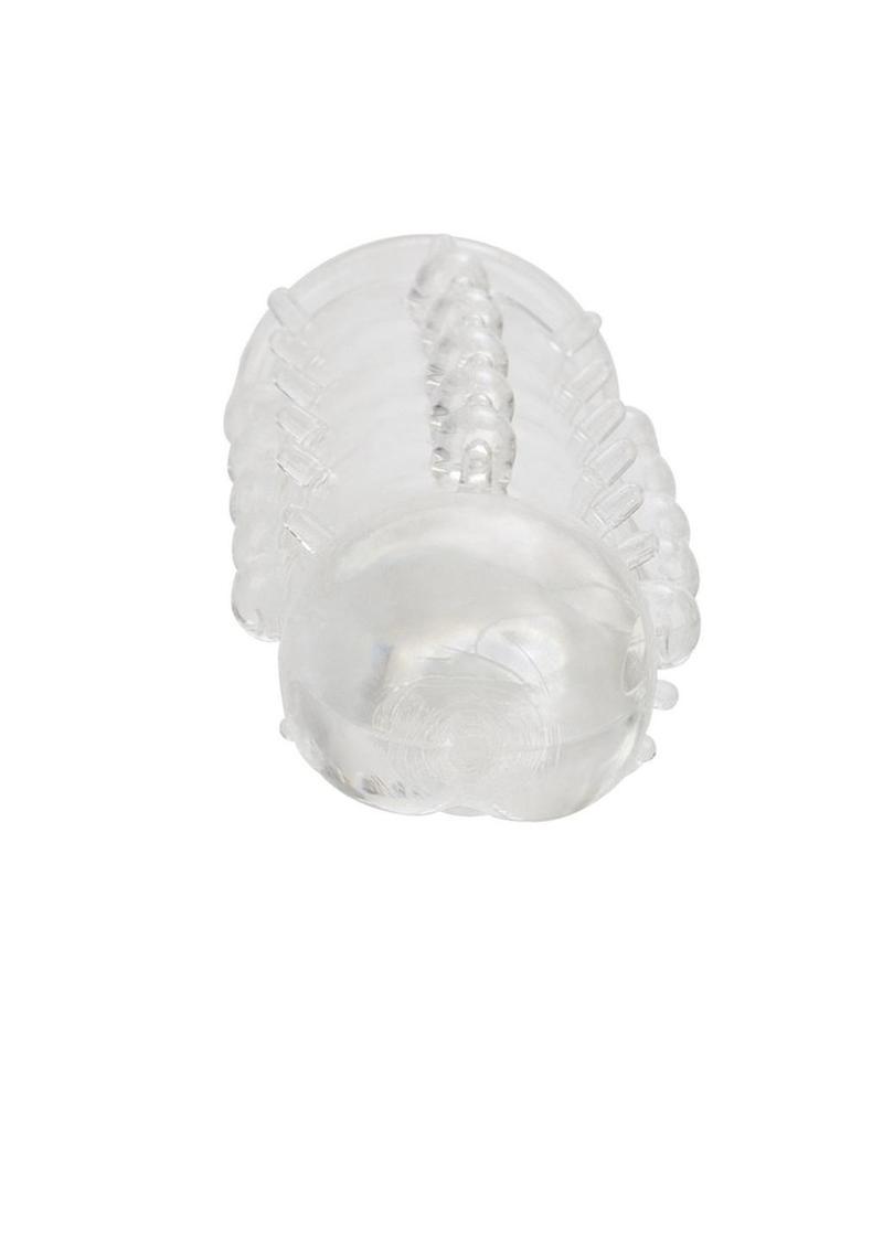 xSoft, textured and stretchy penis extender adds girth plus 1b / 2.54 cm in length. Support ring secures fit.