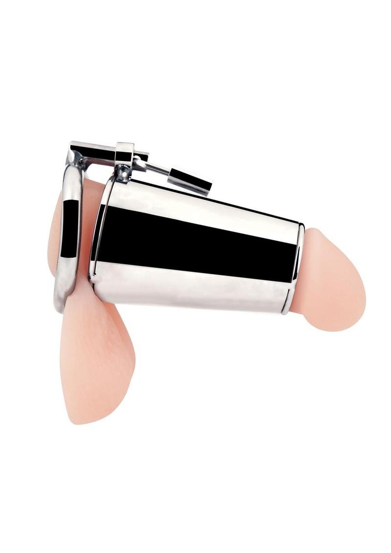 xThe Ultimate Cock Tease Cage is a cylinder-shaped chastity device that provides a nearly solid enclosure to the shaft, exposing just the tip. When the Ultimate Cock Tease Cage is worn, the wearer can experience the way that denying sensation heightens arousal to explosive new levels. With a separate ring to wear around the testicles, this chastity device offers a kinky sensation boost. Lock the device in place using the included padlock to keep him securely entrapped.