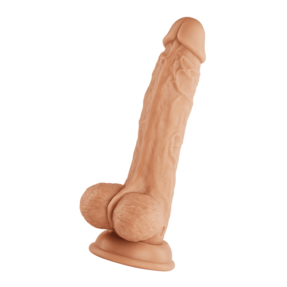 Realistic silicone dildo vibrator with balls features 8 vibration modes and two motors. Wireless waterproof remote control is rechargeable, like the vibrator. Features turbo button and vortex motion. Suction cup for hands free fun.