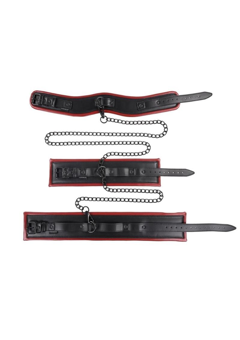 xStrap them in, things are about to get hot. Enhance your next scene with the Saffron Chained & Tamed, expertly designed to keep your partner at your mercy. Use all the pieces together or interchangeably for optimum positioning. Begin your next session with the posture collar for added control. Then add the double wrist cuff to lock their hands together and the double ankle cuff to keep them in place. Next, connect the cuffs and collars how you see fit and exude your power over them.