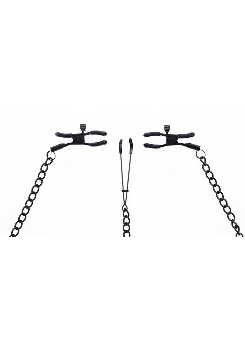 xIgnite your passions and take intimacy to sensational new heights with the Saffron Nipple to Clit set. Perfectly crafted for use both in and out of the bedroom, feel the illustrious black chains drape down your body from the connected chain collar. Tease yourself with attached nipple clamps to add pressure and arousal to your most sensitive areas while a third tweezer clamp stretches down to your clit for tantalizingly seductive tension. Perfect to create heightened experiences during sensation play or as a playful reminder of your submissive place as its worn under your clothes. Secure and comfortable, the Nipple to Clit Set allows you to reign in your pleasure however you like as they tug and tease with every movement.