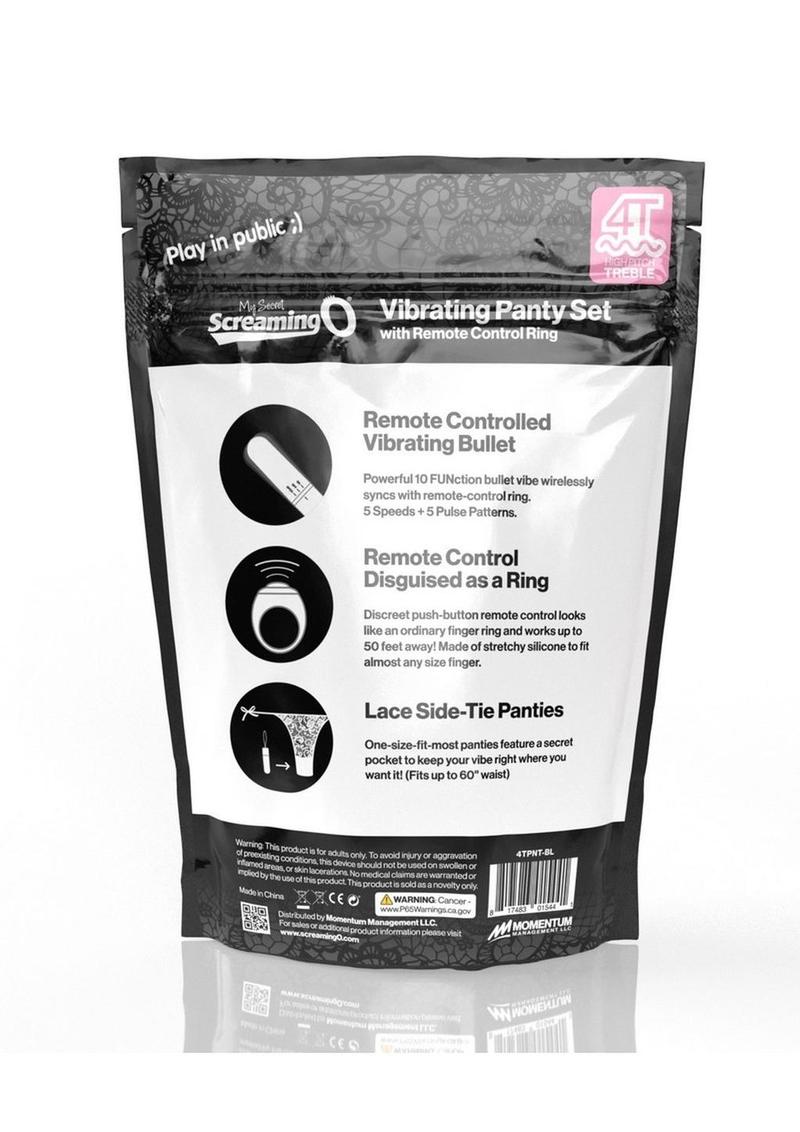 xMy Secret Screaming O 4T Panty Vibe puts the power of pleasure at your fingertips with a powerful, 4T treble style tickle and tease vibrating bullet that fits discreetly into a side-tie lace panty to keep it in place. Simply slip the bullet into the pantyb s small pocket and enjoy powerful stimulation directly on the sweet spot. This sexy and subtle mini vibe allows you play in public with a clever remote control disguised as an ordinary finger ring and works up to 50 feet away! The vibe is b monogamousb meaning it can only speak to one remote at a time. This way, you always know who is turning you on!