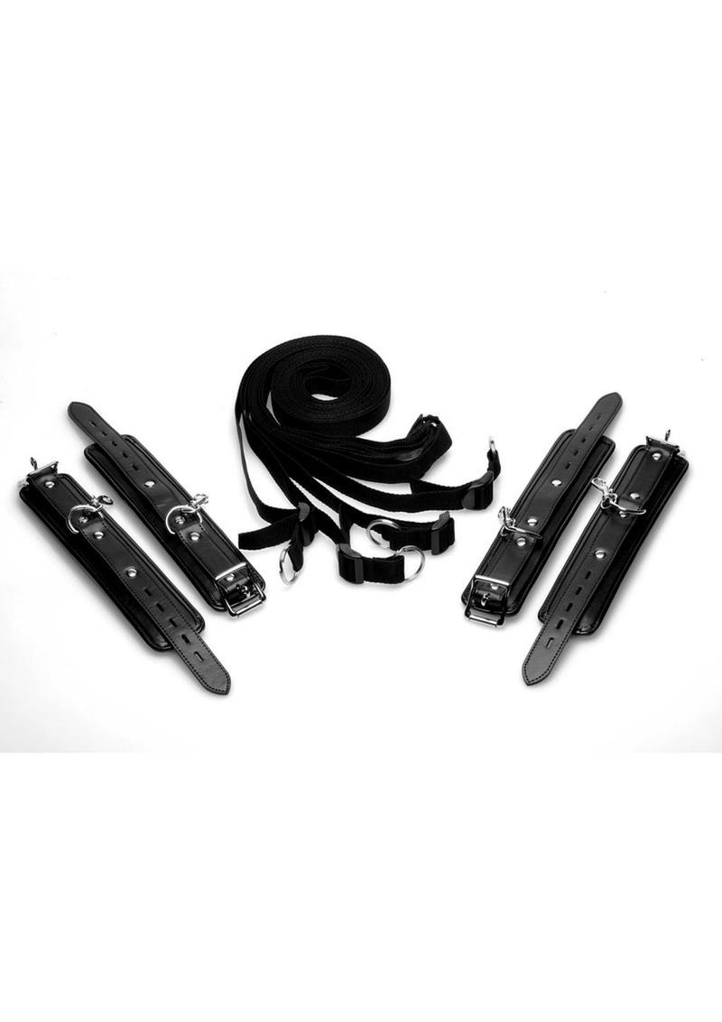 xStrap your partner down to the bed and turn them into your personal submissive pet! Instantly transform your bed into a piece of bondage furniture, perfect for opening your lover up, spread eagle! They will be writhing in ecstasy as you please, tease, and torment their helpless body. The sturdy cuffs are lined with comfortable padding so that you play things wrists and ankles will not grow sore as play sessions last long into the evening. The buckle allows for a wide range of adjustment to fit most sizes, and also locks so that your lover will feel even more deliciously trapped and confined. Just slide the restraint set under your mattress and pull the cuffs and straps up at the corners. Adjust the straps as needed to fit all bed sizes. Spice up your sex life and you will never want to get out of bed!