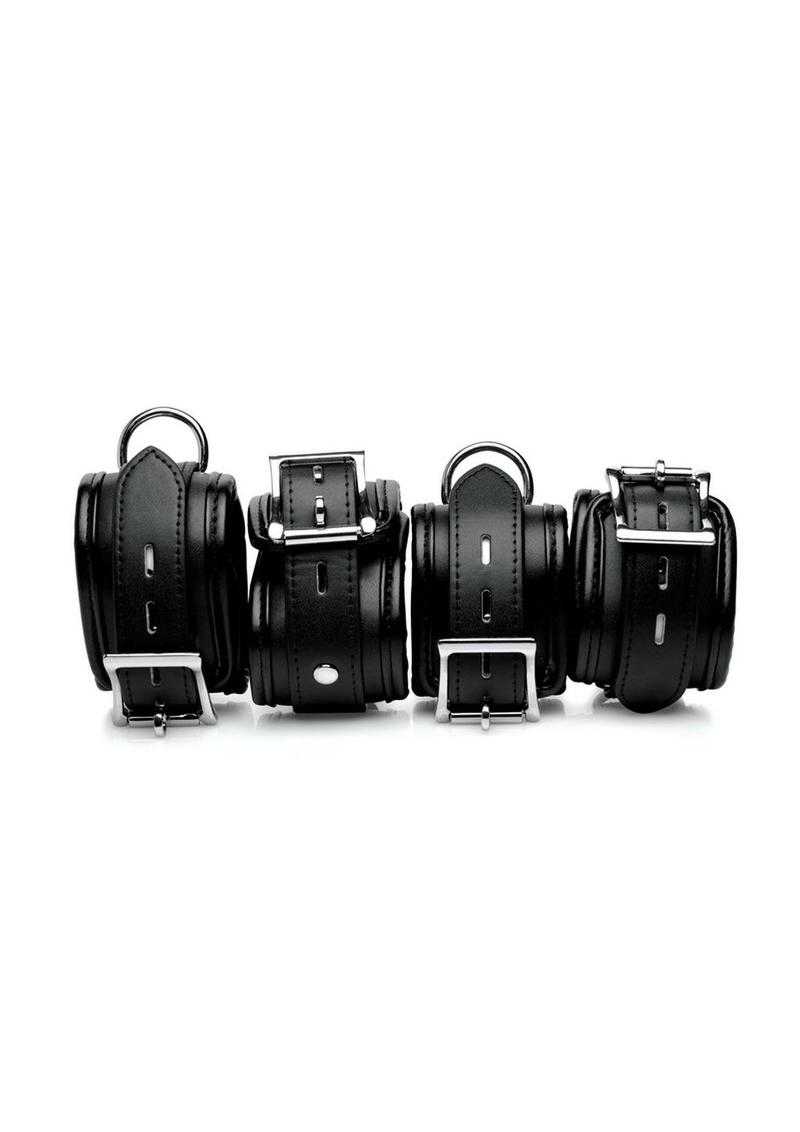 xLimit your slaves mobility and remind them of your total control with an attractive and comfortable shackle set. The leather-like collar and 4 cuffs feature internal padding, adjustability, and locking buckles. All five accessories are connected via their D-rings and swiveling clasps to a series of chains to create a full-body restraint. Privately appreciate or show off your plaything in beautiful bondage when you keep them on their feet or force them on all fours.