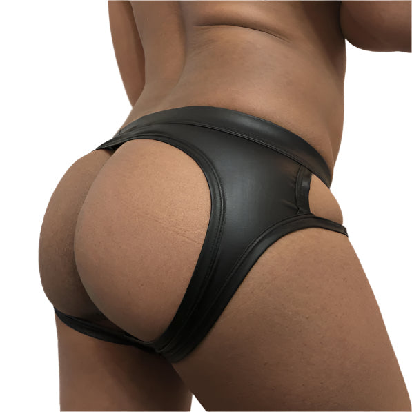 - Vegan leather jockstrap with metal details and seductive cutouts